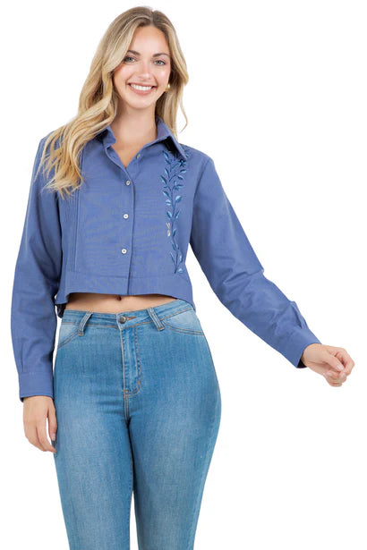 Confeccionada en algodón fresco y con un delicado bordado azul que resalta sobre el fondo marfil, es ideal para días cálidos o salidas casuales con estilo. Su corte crop aporta un look juvenil y sofisticado que puedes combinar con pantalones de lino, jeans o faldas fluidas.