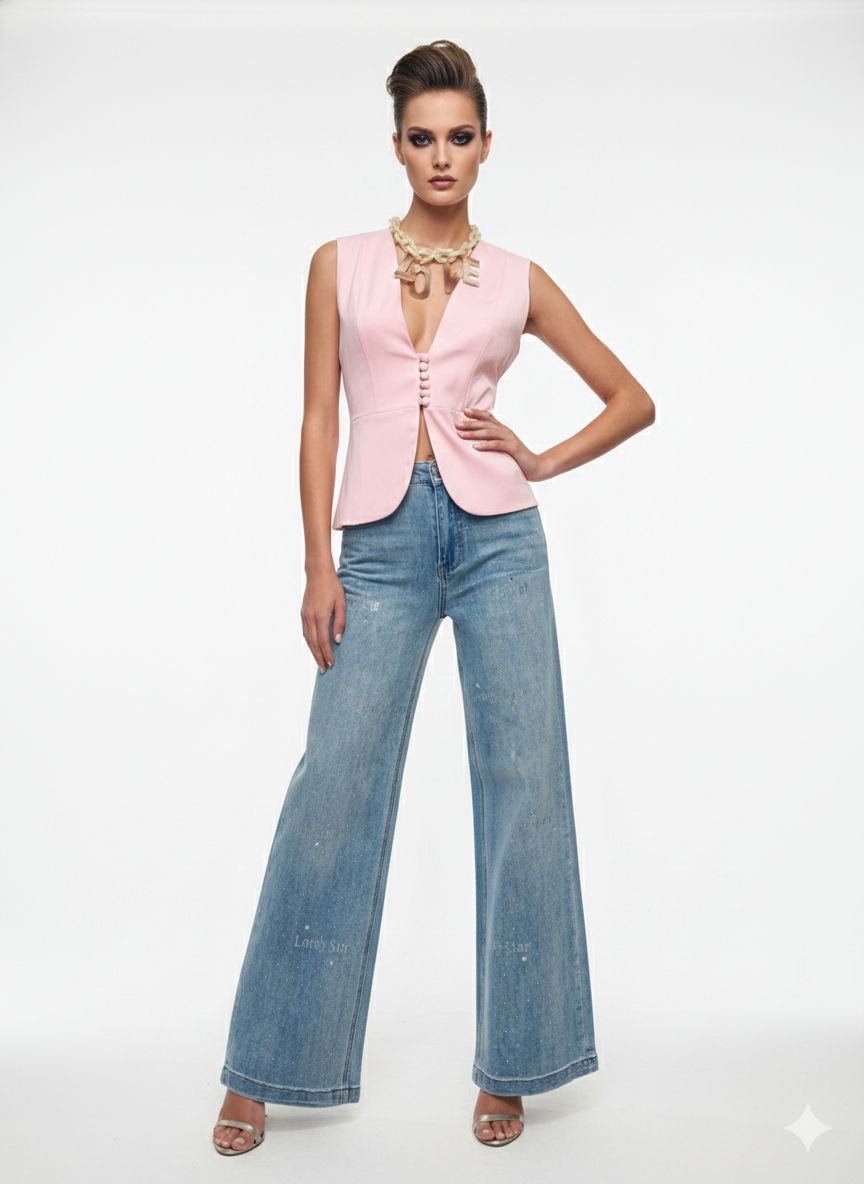 Espectacular jean italiano de pierna ancha con un sutil brillo de estrellas que le da un toque glamoroso y único. Diseño de tiro alto que estiliza la figura con corte wide leg moderno. Confeccionado en Italia con mezclilla de alta calidad y detalles brillantes discretos que capturan la luz.