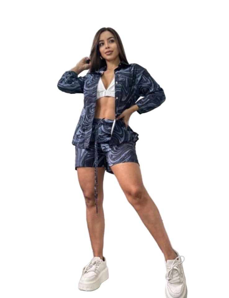 Este set de tres piezas con estampado marmoleado negro es la mezcla perfecta entre lo urbano y lo chic. Compuesto por una camisa ligera tipo chaqueta, top blanco y un short con amarre en la cintura, es ideal para looks cómodos pero con presencia.