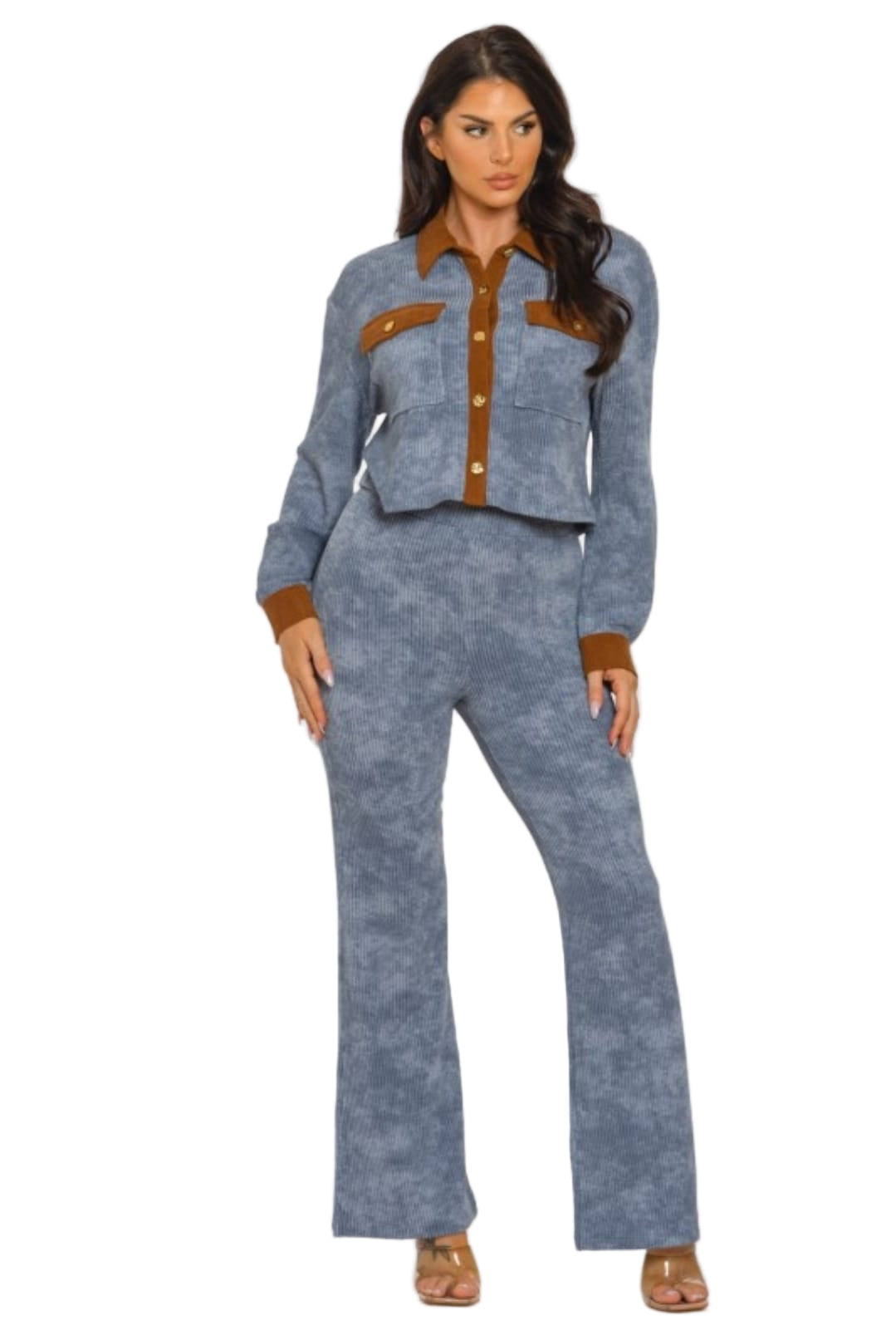 Set de dos piezas en azul con detalles marrón. Materiales de alta calidad, elegante y versátil para cualquier ocasión. Estilo refinado y funcional. ¡Compra ya!