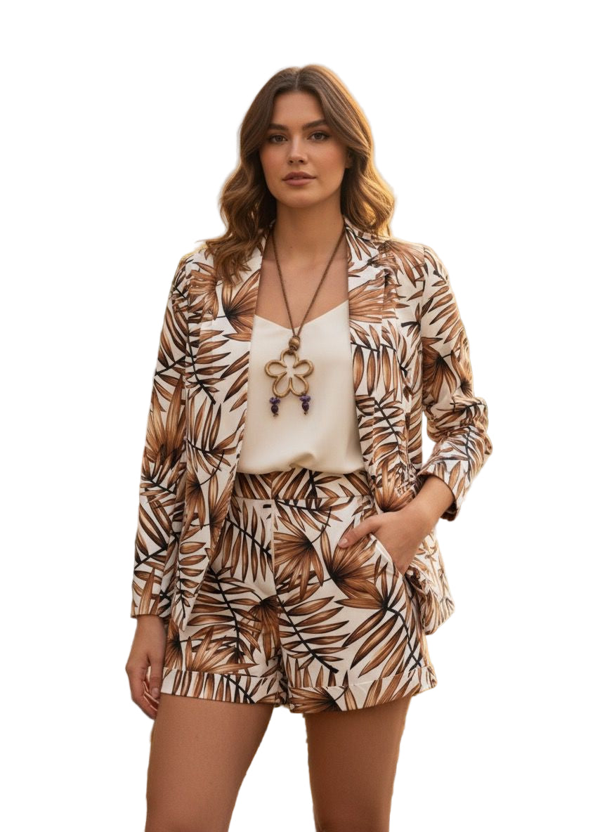 El Short OVI combina comodidad y elegancia en una sola pieza. Confeccionado con un estampado tropical que armoniza con el Blazer OVI, ofrece un ajuste favorecedor y moderno. Su cintura alta y corte recto estilizan la figura, convirtiéndolo en una opción perfecta para días soleados o looks relajados con estilo.